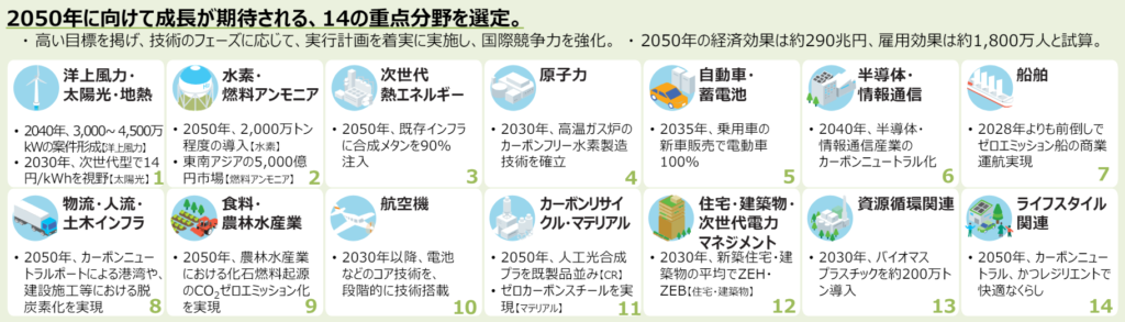 グリーン成長戦略「実行計画」の14分野は以下の通りです。